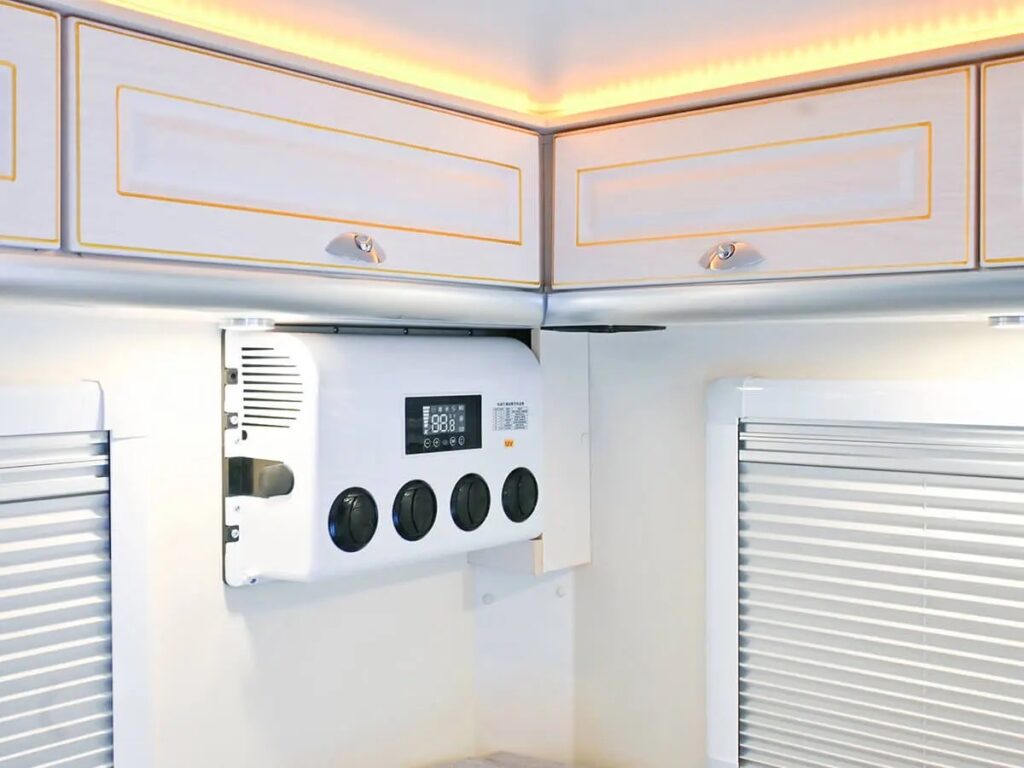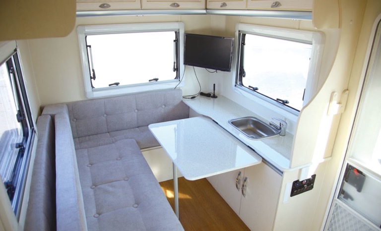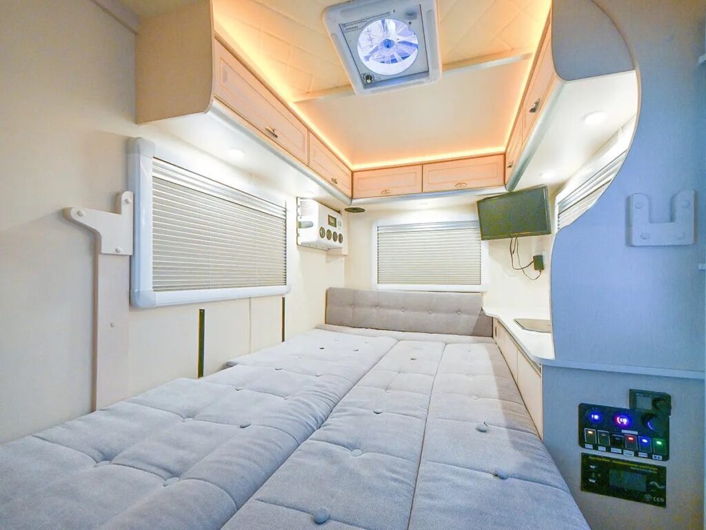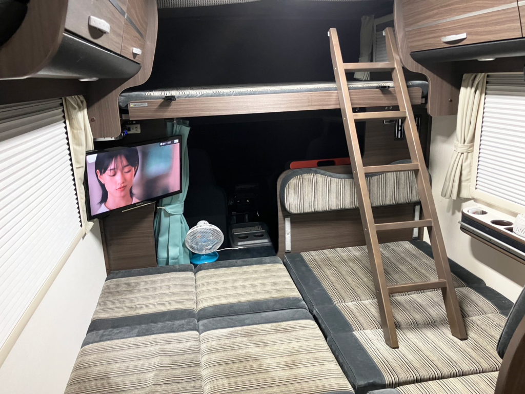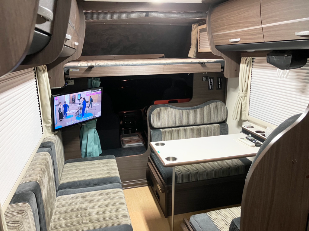 ゆったりL字型ベンチシート!20インチTV完備!高さが175㎝あるので立って移動できます。