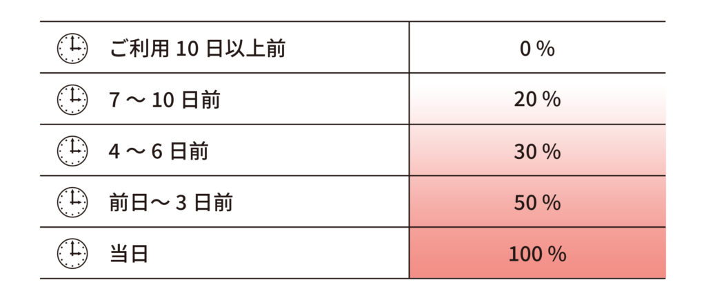 ご予約確定後、お客様のご都合によるキャンセルにはキャンセル料金が発生しますので、ご注意ください。