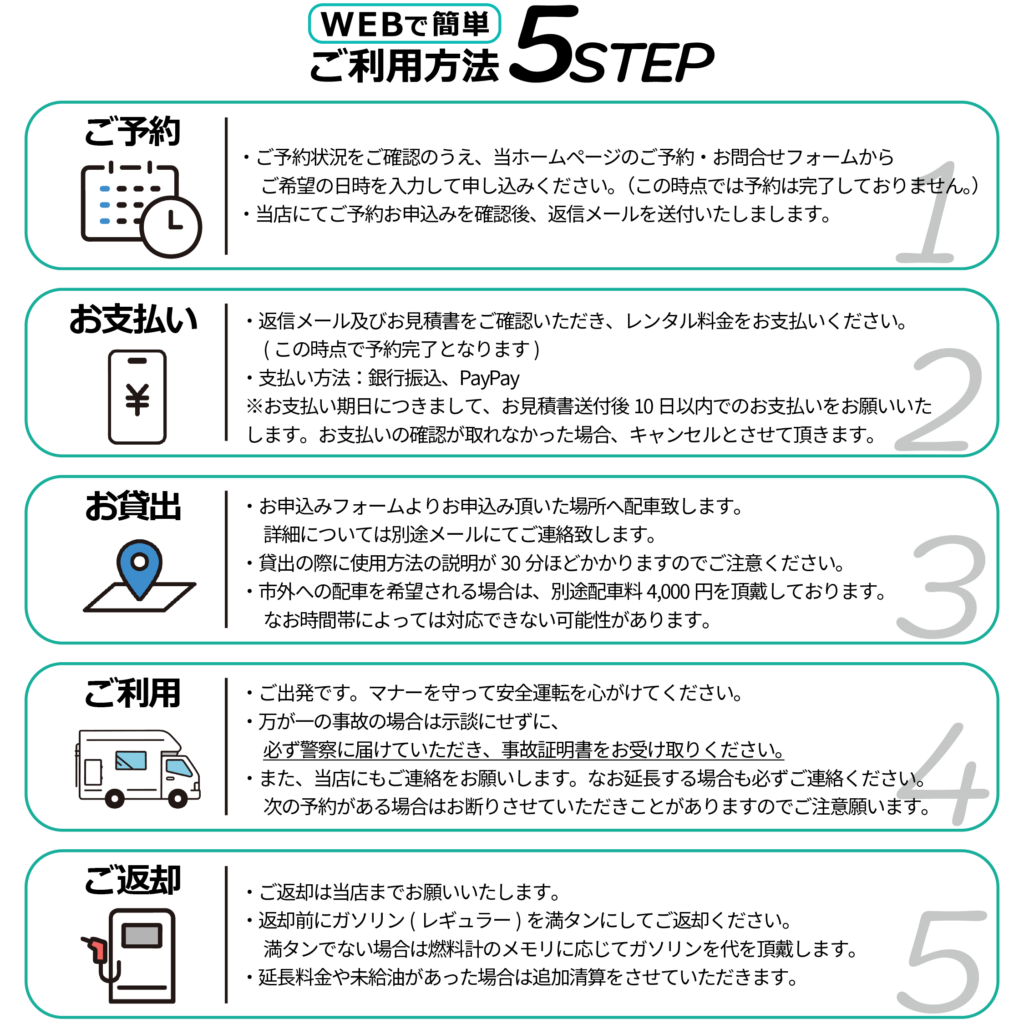 車両スペック◯ベース車両:TOYOTA カムロード(ABF-TRY230改)◯燃料:ガソリン◯方式:AT車◯車体寸法(mm):全長4,990×全幅2,080×全高3,150mm◯乗車/就寝定員(名):7名/最大5名就寝可能(子供とであれば6人可能)◯設備:家庭用エアコン/冷蔵庫/FFヒーター/シンク/テレビ/ソーラーパネル/サイドオーニング, etc.