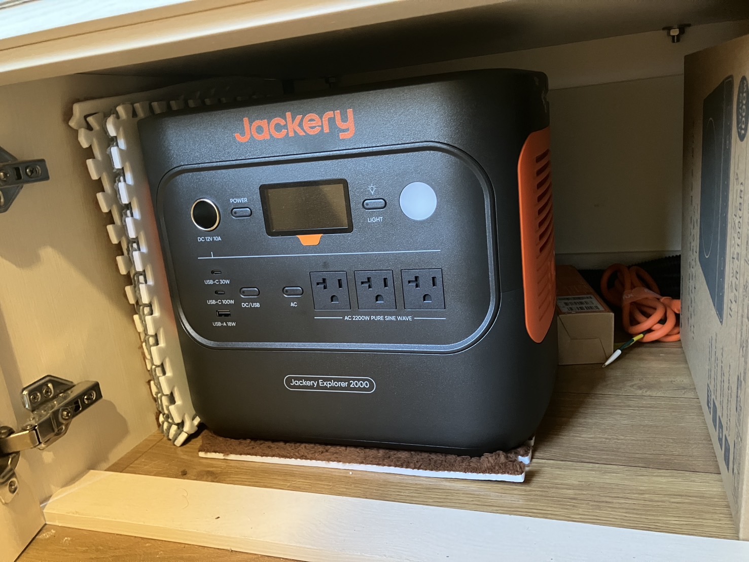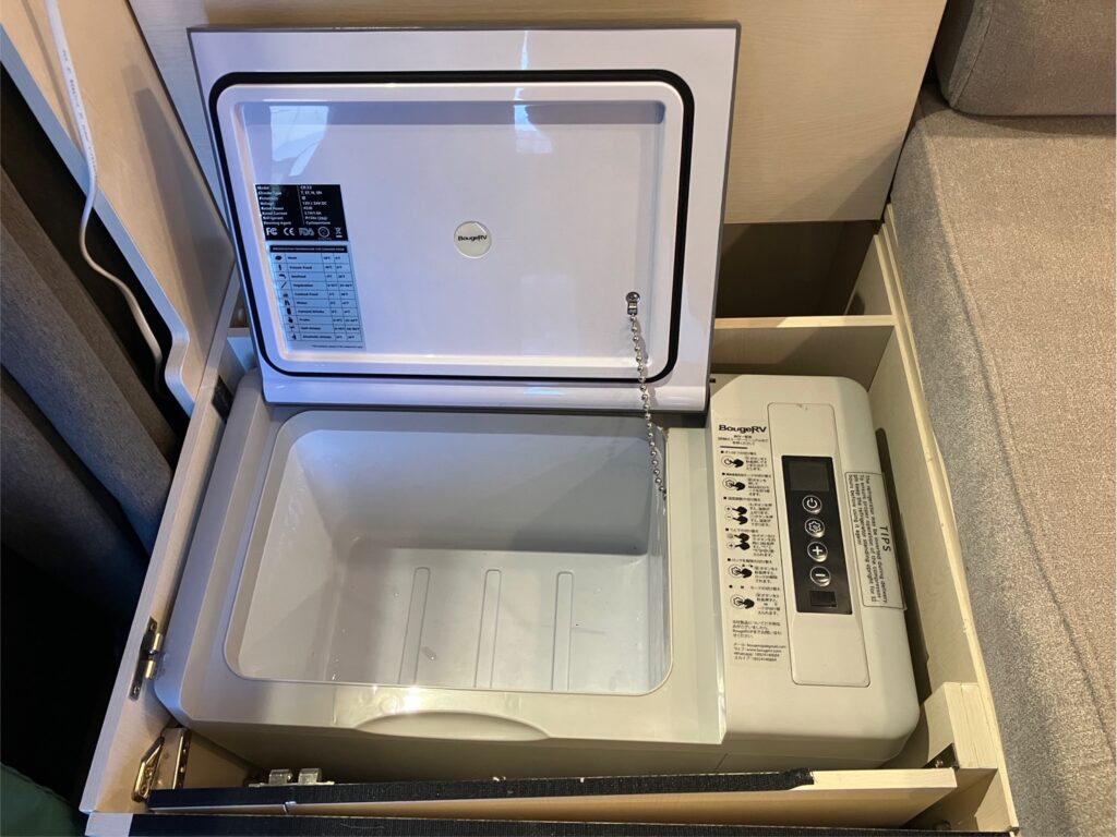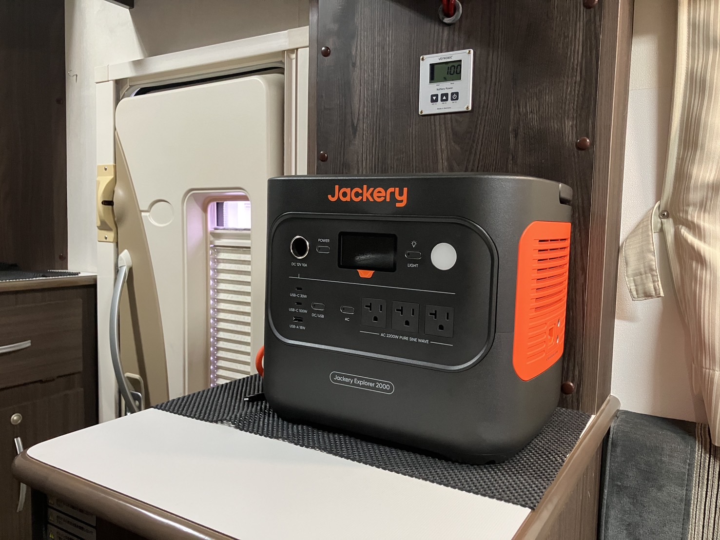 Jackeryの外付け大型バッテリーをサービスで搭載しているので、エンジンを停めても、レンジや電気ポットが使用できるので長旅にも最適です。