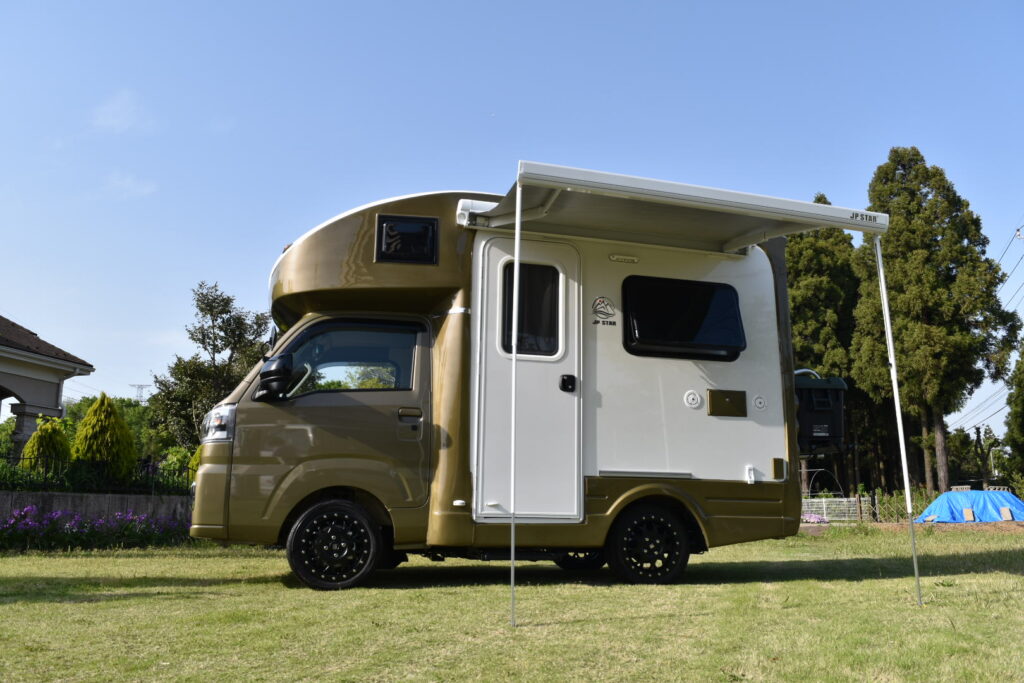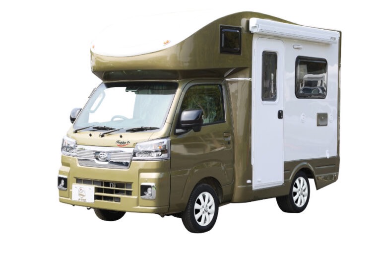 車両スペック◯ベース車両:ダイハツハイゼット(軽車両)◯燃料:ガソリン◯方式:AT車 4輪駆動◯車体寸法(mm):全長3,790×全幅1,690×全高2,480mm◯乗車/就寝定員(名):4名/最大4名就寝可能◯設備:DCエアコン/冷蔵庫/FFヒーター/シンク/テレビ/ソーラーパネル/サイドオーニング, etc.