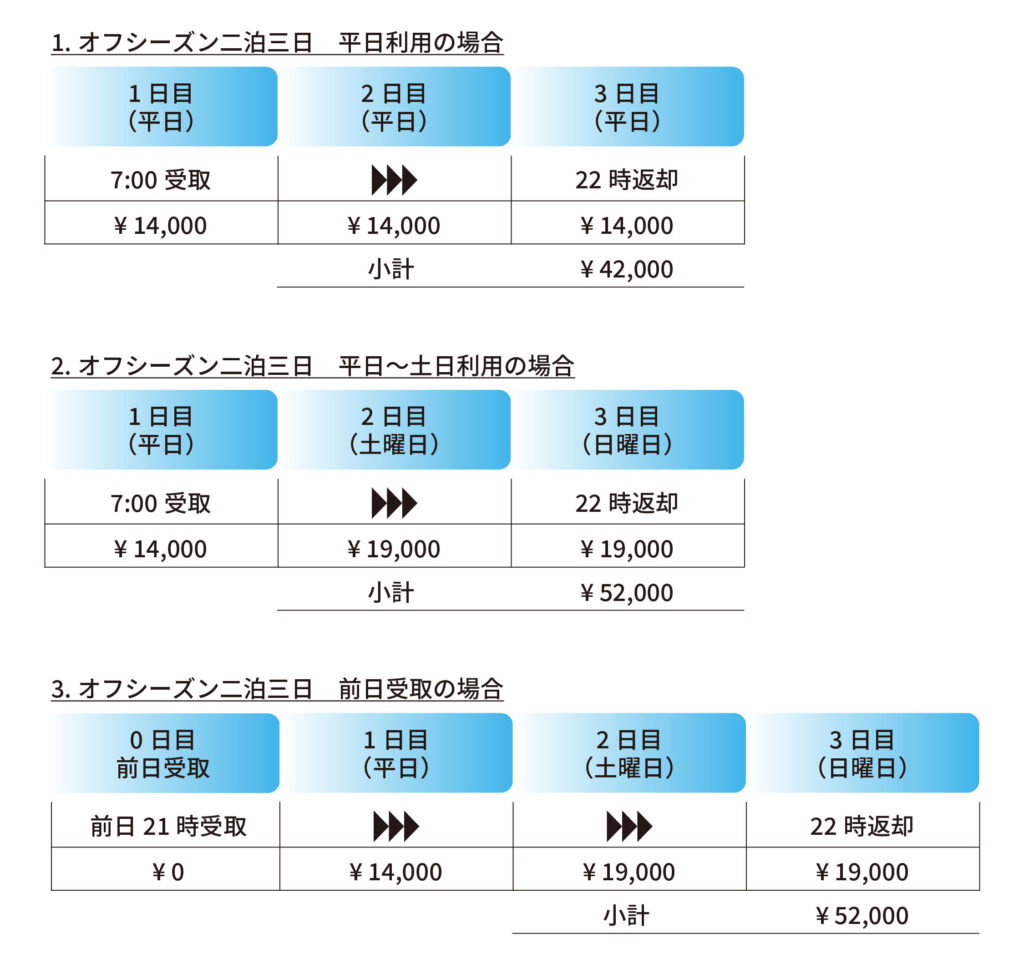 ・ご予約いただいたレンタル開始日の前日、21時前後に前もって車両の受取が可能です。
